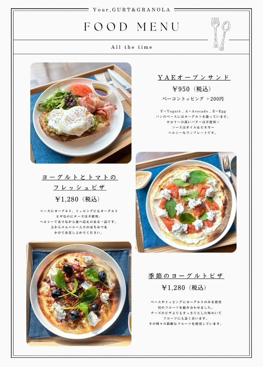 Welcome to Your,GURT&GRANOLA, a delightful café nestled in Mizuho, Gifu. This charming spot specializes in greek yogurt, known for its rich, creamy texture and health-conscious, sugar-free ingredients. The highlight of the menu is undoubtedly the seasonal yogurt specials, like the luscious ももぐると featuring fresh peaches paired perfectly with homemade granola.